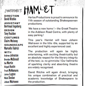 This clear, well staged production of Hamlet impressively delivers a masterclass in Shakespearean verse speaking. Harlos Productions make a welcome return to the Sydney stage with this most impressive rendering of the enigma that is Hamlet.