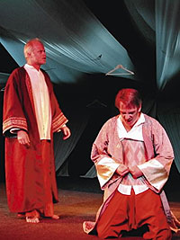 David Ritchie's Lear is more primal and sullen, the authentic pagan monarch who is old before he is wise but less the foolish, fond old man. The production uses Japanese imagery (kimonos and sticks) but that's partly perhaps due to the ease of changing kimonos, as in numerous sequences where actors walk behind one of the Pav's pillars (an architectural defect rarely used better) and instantly re-enter as somebody else.