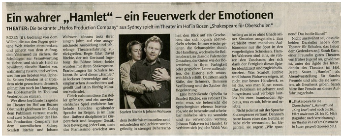 In 2006 and 2007 Scarlett doubled Cordelia/Oswald in consecutive productions of King Lear by Harlos Productions. She continued her working relationship with Harlos in Hamlet, playing Ophelia for them in both 2009 and 2010.